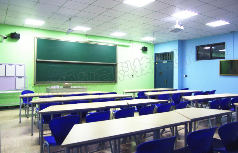 藍(lán)綠相間的清新色調(diào),讓這里的學(xué)習(xí)氛圍顯得格外的輕松愉悅。有別于傳統(tǒng)方式課桌,一張張?zhí)菪涡∽雷?,可自由拼接成圓形討論桌,有利于學(xué)生在課堂上的討論與互動。