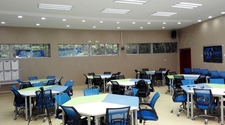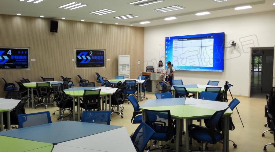 智慧教室不僅重視人機互動,更重視人與人之間的互動。智慧教室在環(huán)境布局上有很大的改動,我們更傾向于教師與學(xué)生互動的形式,激發(fā)學(xué)生的學(xué)習(xí)興趣和自主學(xué)習(xí)能力。所以在智慧教室,我們把豐富多彩的配色和自由拼接的桌椅帶進(jìn)課堂。在教室使用過程中,智慧教室支持更為開放的情境式、探究式教學(xué),鼓勵小組互動討論,通過移動端投屏加強師生之間、生生之間的實時交流與反饋。